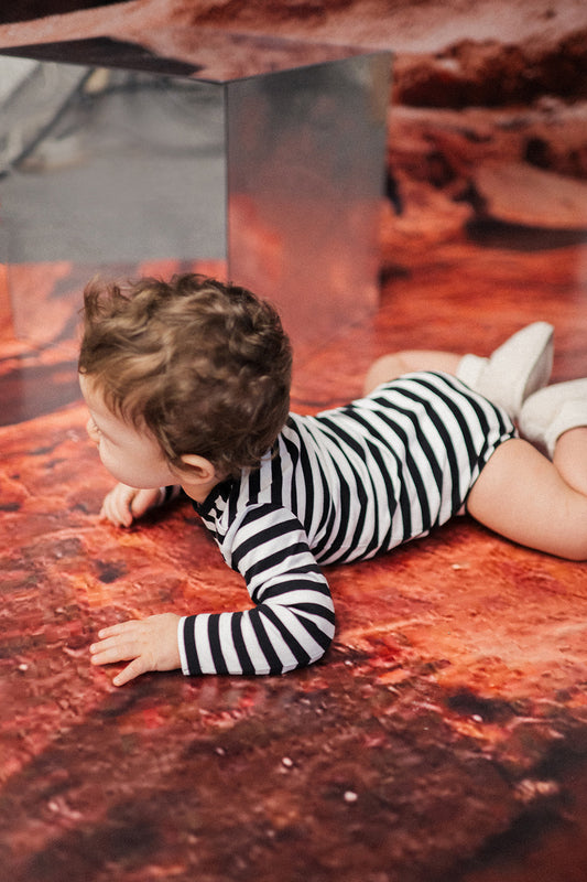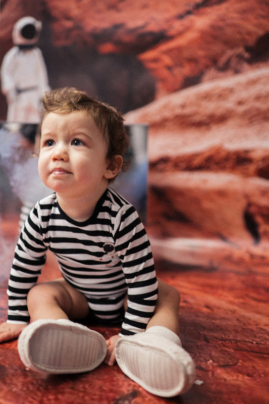 Stylish and cozy baby bodysuit with a space-themed design! This adorable onesie features black and white stripes with an astronaut print, combining fashion and comfort. Designed for practicality, it has convenient snap buttons on the shoulders and bottom for easy dressing and diaper changes. Crafted with the most sensitive and eczema-prone skin in mind, this bodysuit is incredibly soft and gentle. Made from Oeko-Tex 100 certified materials, it's produced by Hebe in Latvia, adhering to European Union manufacturing standards for quality and safety. Perfect for your little trendsetter, this space-inspired bodysuit is not only fashionable but also easy to care for, making it a practical choice for parents. Don't forget to explore our other baby clothing collections for more adorable options!