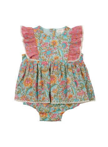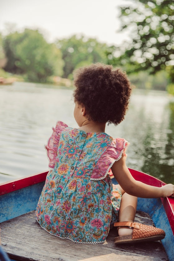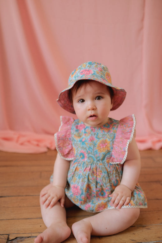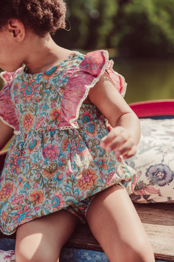This adorable baby girl romper, Lena, in a water flower pink print, is the perfect outfit for the summer. Designed like a baby dress, this baby romper is made of lightweight organic cotton with lace edges. The romper features elastic around the legs, a snap opening, and buttons on the back for easy wear. It is also entirely lined for added comfort. Made with breathable organic cotton, this baby clothing is available in a pink print of a water flower by Louise Misha. It is the dress-style romper of every baby girl's dreams, and a Mini Me style baby romper is also available in this breathable organic cotton fabric.