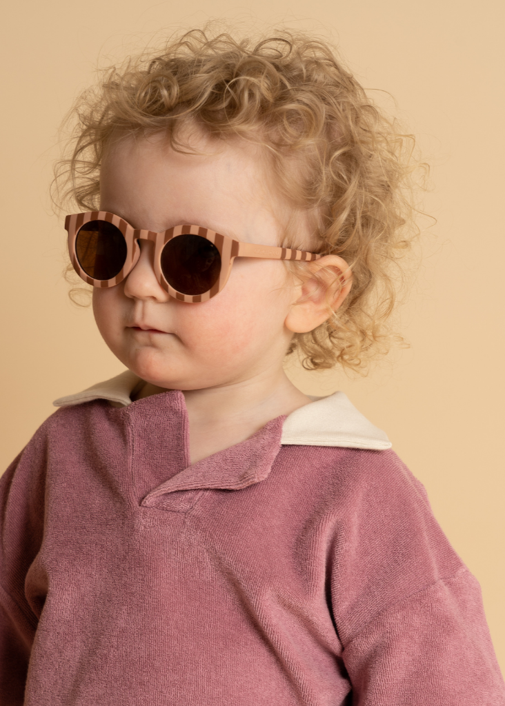 The new version of sustainable baby sunglasses in Stripes Sunset + Tierra (pink girl sunglasses) by Grech & Co is featured in an eco-friendly/non-toxic break-resistant material - offering higher durability and longevity for use through its flexible form. These sustainable baby sunglasses from Grech & Co are the conscious choice for mini-me sunglasses in stylish colours and with polarised lenses and UV400 protection from the sun. With their flexible design, these baby sunglasses are perfect for active little ones. The pink girl sunglasses are a particularly stylish choice for your little fashionista. Choose Grech & Co for high-quality, sustainable baby sunglasses that are fashionable and durable.