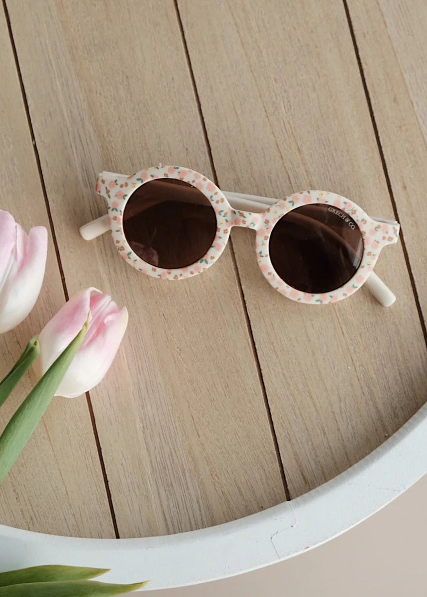 Our very popular sustainable kids round sunglasses are now available in the cutest meadow print - the pink flower print. These eco-friendly and sustainable girl sunglasses made by Grech & Co are crafted with non-toxic break-resistant material, ensuring higher durability and longevity through their flexible form. With these sunglasses, you won't have to worry about them breaking easily, making them perfect for kids. We just love how flexible these sustainable kids sunglasses are. Grech & Co's sunglasses are the conscious choice for kids' sunglasses, especially in these floral colours. Not only do they come with polarised lenses and UV400 protection from the sun, but they are also designed with sustainability in mind. Mini Me twinning is available in the same print as sunglasses for women. Thanks to their flexibility, these sunglasses from Grech & Co are suitable for ages 18 months up to 8 years. Invest in these sustainable kid's sunglasses now and enjoy their longevity and style for years to come.